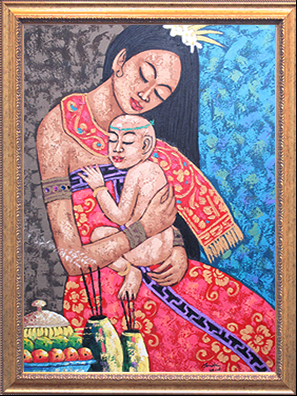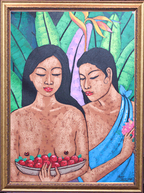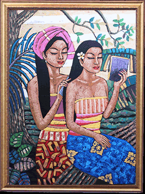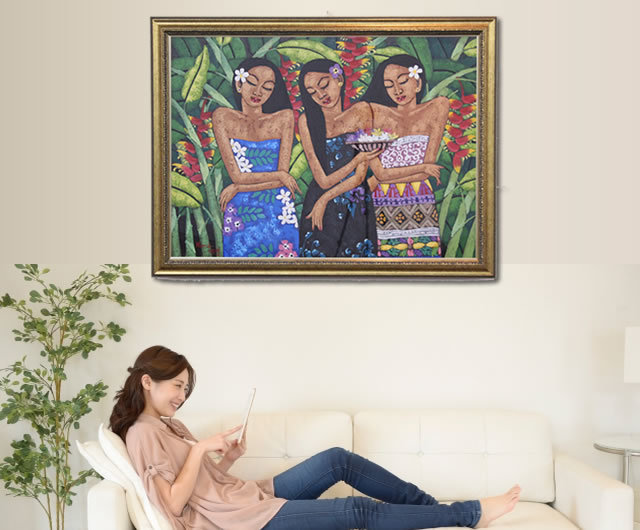 当時は絵画としてではなく、王宮の装飾画として発展をしていきました。その中で、大きな転換点を迎えることになります。それは19世紀のオランダによる植民地化です。その時に、西洋の技術が取り込まれ、様々な技法(スタイル)が生まれていきました。遠近感や影、鮮やかな色彩を使ったウブドスタイルや現在人気の高いモダンスタイルなどがあります。様々な技法が発達する事でバリ絵画は国際的な水準のレベルまで引き上がりました。しかし、旧来の技法は失われることはありません。古来から続くカマサンスタイルのようなスタイルも受け継がれ、そしてより高い完成度を目指して発展を続けています。その中で、私たちが出会った「癒しのバリ絵画」は油絵具を使用した、優しいモダンスタイルの絵画でした。バリ島女性の優しさの中にエキゾチックな雰囲気を感じるヒーリングアートの最高傑作です。