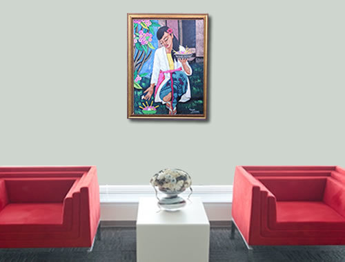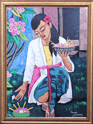 美しいバリ人女性がお供え物「チャナンサリ」を持ち、花を摘んでいる絵画です。落ち着いた女性の表情を見ると、不思議と癒されます。クリニックや美容院、マッサージ店など様々な場面で飾っていただけます。