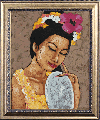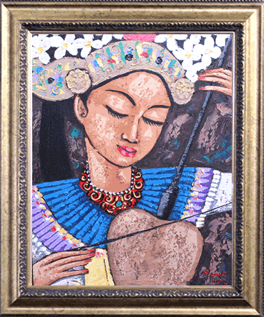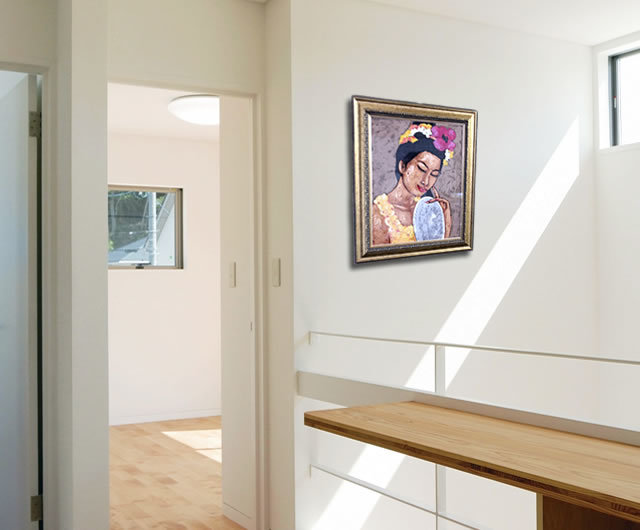 花飾りを髪に飾ったバリ人女性がうっとりしている一枚です。何かいいことがあったかの様な穏やかな幸せ感を感じます。小さ目の絵画なので、家の個室や廊下、ネイルサロンやクリニックと、様々な場面で飾っていただけます。