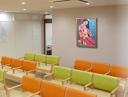 美しい母親が我が子を抱きしめる一枚です。母親の穏やかな表情と我が子の健やかな寝顔に平和を感じます。中サイズの絵画なので、家の中や、エステサロン、クリニック等、様々な場面で飾っていただけます。