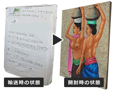 他店では、輸送費用を下げるために丸筒などで絵画を丸めて輸送することもありますが、その結果絵の具が剥がれたり傷ついたりして絵画が痛む可能性があります。そこで当店ではそのままの形で輸送し、絵画の品質を保つ事を第一としておりますので、ご安心ください。