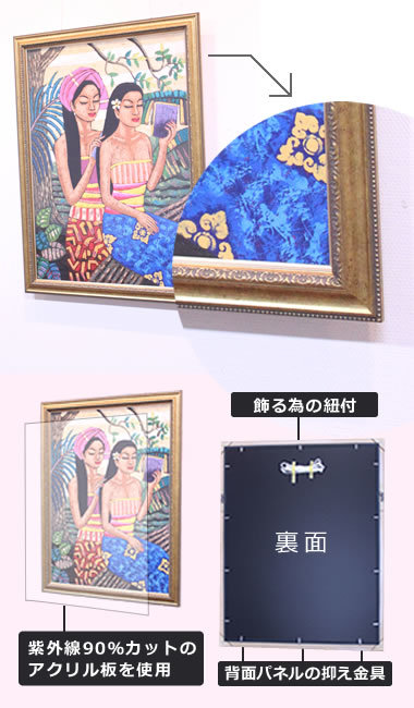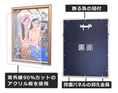 国内製の額縁ですので、裏面もしっかりと作られています。飾る為の金具や紐も付いているので届いたその日に飾ることが出来ます。また、表面カバーは硝子ではなく紫外線90%カットのアクリルを使用しているので絵画の日焼けを防ぎ、万が一震災などで絵画が落下しても、ガラスの様には割れません。