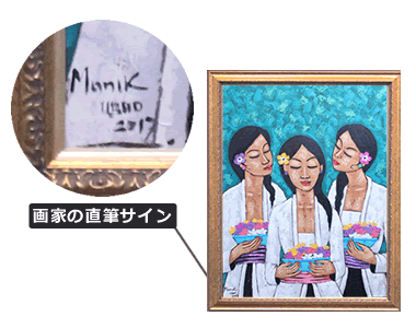 当店のバリ絵画には画家の直筆サインと証明書が付いています。これは画家が作品を承認したという証拠です。世界で一つしかない絵画という証明になります。
