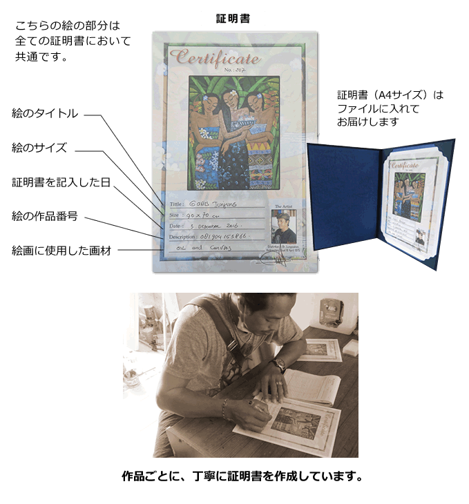 当店のバリ絵画には画家の直筆サインと証明書が付いています。これは画家が作品を承認したという証拠です。世界で一つしかない絵画という証明になります。この証明書にはタイトル、サイズ、製作日、画家の写真などが掲載されています。