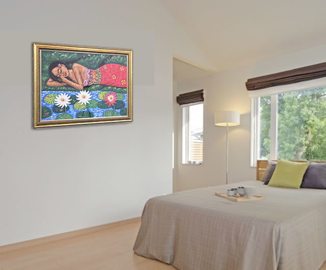 バリ人女性が民族衣装に身を包み、リラックスしている一枚です。観ていると、落ち着いて安心してくる絵画です。 中サイズの絵画なので、家の中や、エステサロン、美容院、スパ、温泉施設など様々な場面で飾っていただけます。