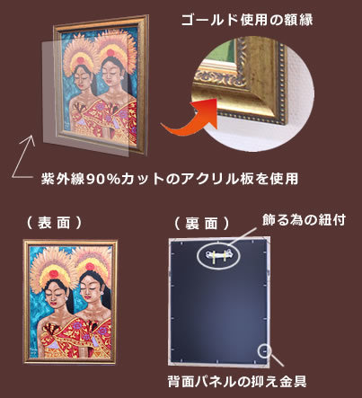 | 原産国 | 絵画:インドネシアバリ島 額縁:日本(オーダーメイド、壁掛紐付) |