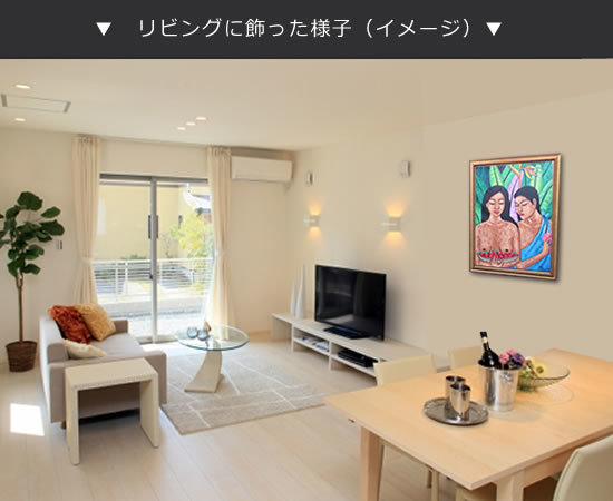中サイズの絵画なので、家のリビングや玄関、エステサロンや美容院など様々な場面で飾っていただけます。果物を持ち、好きな人を思い浮かべている女性と友人を描いた絵画です。