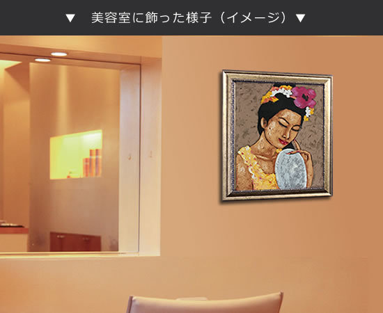 小さめの絵画なので、家の個室や廊下、ネイルサロンやクリニックと、様々な場面で飾っていただけます。手鏡を持ち、そっと微笑む少女の姿に癒されます。