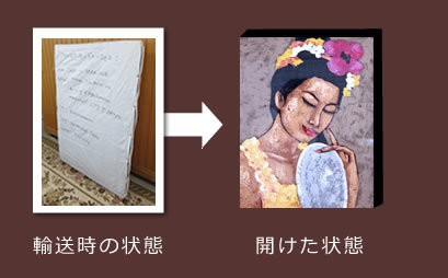 当店の絵画は、作品を傷めない為に木枠ごと買付けをし、空輸で運んでおります。到着後は隅々まで検品を行い絵画に傷がないかどうかを確認します。安心してお客様にお届け出来る様にしております。