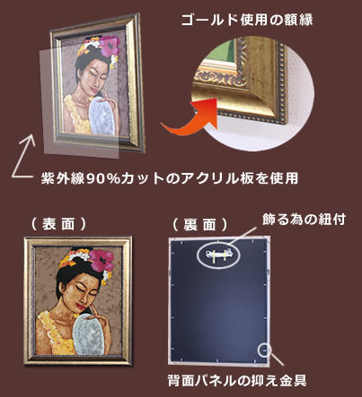 | 原産国 | 絵画:インドネシアバリ島 額縁:日本(オーダーメイド、壁掛紐付) |