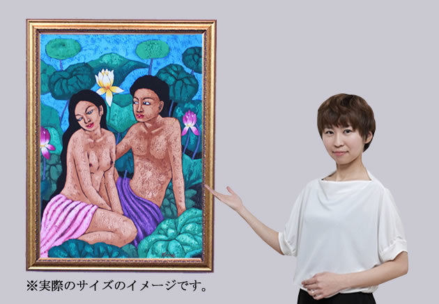 中サイズの絵画なので、家のリビングや玄関、エステサロンや美容院など様々な場面で飾っていただけます。蓮のグリーンを背景にリラックスした男女が会話を楽しむ絵画に癒されます。