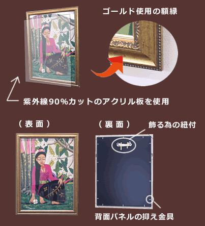 | 原産国 | 絵画:インドネシアバリ島 額縁:日本(オーダーメイド、壁掛紐付) |