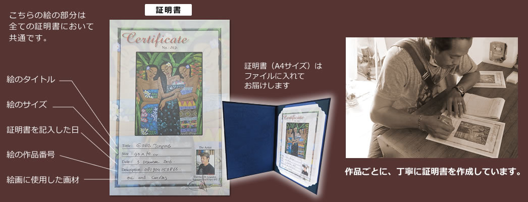 当店のバリ絵画には画家の直筆サインと証明書が付いています。これは画家が作品を承認したという証拠です。世界で一つしかない絵画という証明になります。