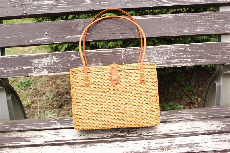 大き目ので丈夫な作りのふた付きアタバッグです。持ち手も大きめに作られているので、肩からも掛けられて、とても持ちやすいです。バッグの編み方が特徴的でおしゃれです。当店のアタバッグはバリ島ウブド村の工房で一点一点丁寧に作られているので、末長くご使用いただけます。
