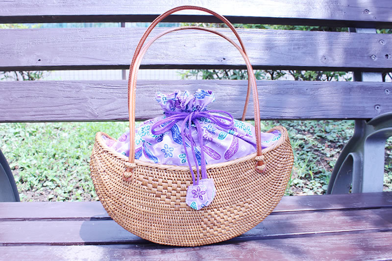 三日月型のアタバッグです。ゆりかごの様な可愛らしい職人技の光る作品です。持ち手も大きめに作られているので、とても持ちやすいです。巾着が外からもよく見えるのでおしゃれのアクセントになります。当店のアタバッグはバリ島ウブド村の工房で一点一点丁寧に作られているので、末長くご使用いただけます。