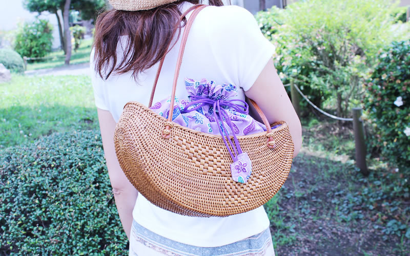 当店のアタバッグは、内側にバリ伝統の布地「バティック(更紗)」を使用しています。外からも可愛い布地が見えるので、ファッションのアクセントにもなります。