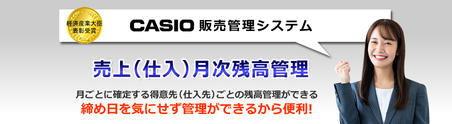カシオ販売システムでは、請求業務や支払い業務で確定する、残高とは別に、月次ごとに確定する得意先・仕入先ごとの残高の管理が可能です。自社の決算の際などに、末締以外の得意先・仕入先の残高が必要になるお客様でご利用いただくシステムです。