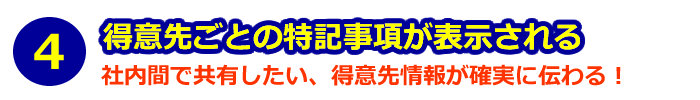 事前に、得意先登録の画面で、各得意先の特記事項(忘れてはいけない注意事項など)を登録しておくと、納品伝票作成時などに、その特記事項が表示されます。例えば、「○○商事は午前中配達希望」と表示すれば、午後に配達してはいけないという情報を共有でき、お客様との関係がスムーズに行きます。