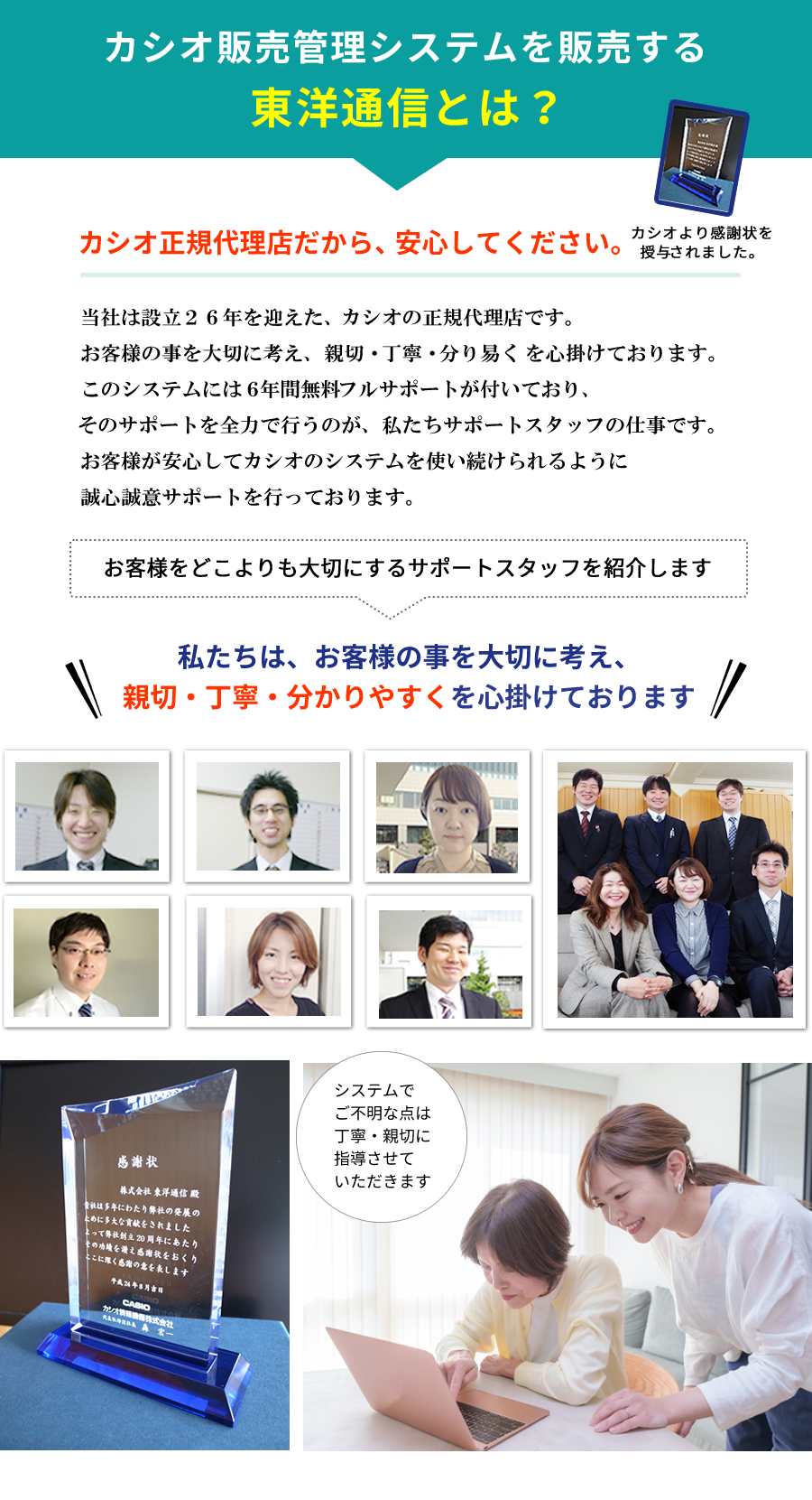 当社はパソコンの操作方法のご相談、メールやインターネットの設定と指導、社内ネットワーク構築、パソコンや複合機の運用方法変更、資格所持者によるマイクロソフトWord、Excelの操作指導も行っております。専門部署がなくIT化に困っていたお客様に対して、様々なサポートを行ってきました。その結果、作業の効率化や経費削減に成功し、数多くのお客様に満足いただいております。東洋通信はカシオ製品だけにとどまらず、IT全体のサポートを行っております!