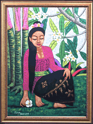 美しいバリ人女性がお供え物「チャナンサリ」を持ち、花を摘んでいる絵画です。落ち着いた女性の表情を見ると、不思議と癒されます。クリニックや美容院、マッサージ店など様々な場面で飾っていただけます。