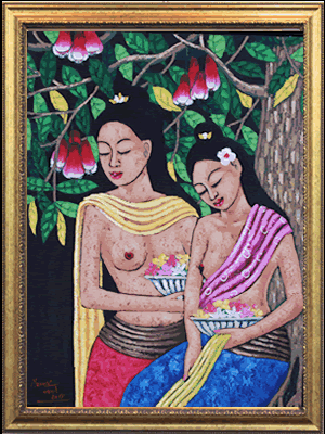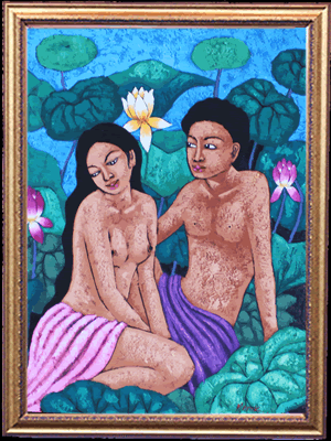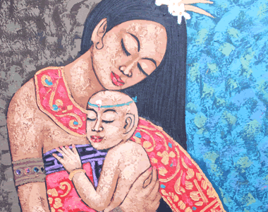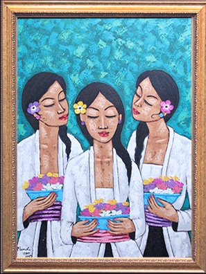 当時は絵画としてではなく、王宮の装飾画として発展をしていきました。その中で、大きな転換点を迎えることになります。それは19世紀のオランダによる植民地化です。その時に、西洋の技術が取り込まれ、様々な技法(スタイル)が生まれていきました。遠近感や影、鮮やかな色彩を使ったウブドスタイルや現在人気の高いモダンスタイルなどがあります。様々な技法が発達する事でバリ絵画は国際的な水準のレベルまで引き上がりました。しかし、旧来の技法は失われることはありません。古来から続くカマサンスタイルのようなスタイルも受け継がれ、そしてより高い完成度を目指して発展を続けています。その中で、私たちが出会った「癒しのバリ絵画」は油絵具を使用した、優しいモダンスタイルの絵画でした。バリ島女性の優しさの中にエキゾチックな雰囲気を感じるヒーリングアートの最高傑作です。