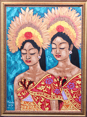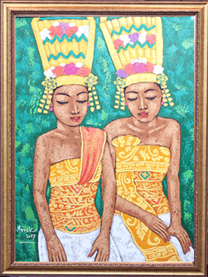 民族衣装に身を包んだ二人のバリ舞踊の踊り子が描かれた一枚です。落ち着いた表情と鮮やかな衣装が印象的で、観る人を惹きつけます。 中サイズの絵画なので、家のリビングや玄関、エステサロンや美容院など様々な場面で飾っていただけます。
