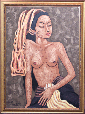 バリ人女性が民族衣装に身を包み、リラックスしている一枚です。観ていると、落ち着いて安心してくる絵画です。 中サイズの絵画なので、家の中や、エステサロン、美容院、スパ、温泉施設など様々な場面で飾っていただけます。