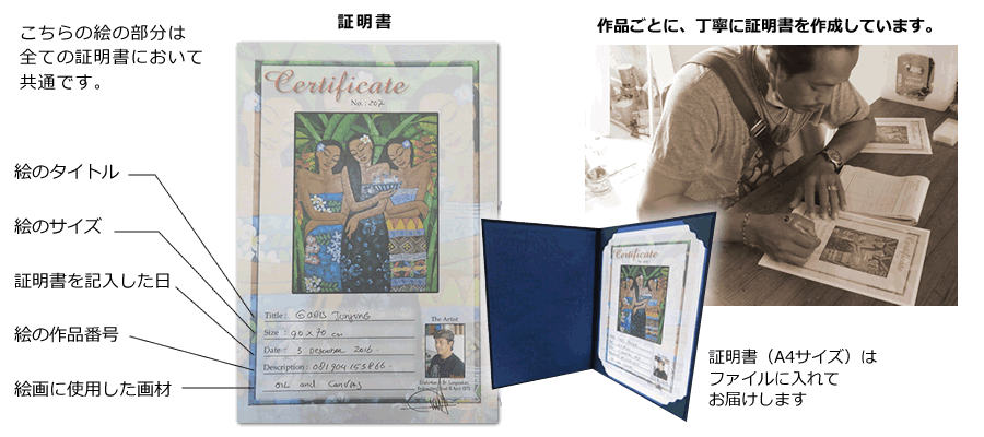 当店のバリ絵画には画家の直筆サインと証明書が付いています。これは画家が作品を承認したという証拠です。世界で一つしかない絵画という証明になります。この証明書にはタイトル、サイズ、製作日、画家の写真などが掲載されています。