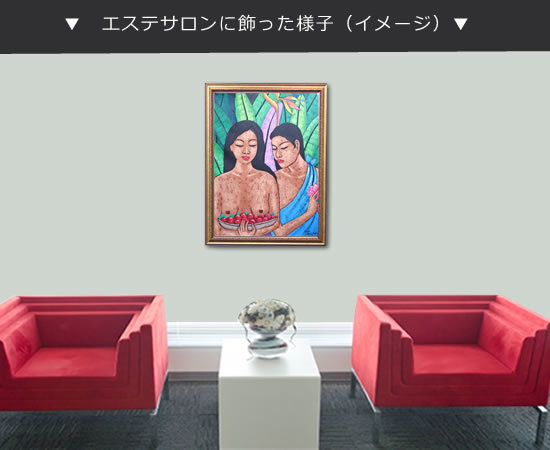 中サイズの絵画なので、家のリビングや玄関、エステサロンや美容院など様々な場面で飾っていただけます。果物を持ち、好きな人を思い浮かべている女性と友人を描いた絵画です。