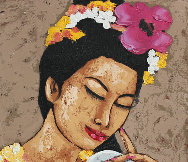 バリ絵画は全て油絵具で描かれています。絵具の凹凸や肉質を感じ、色鮮やかな配色に観る人を惹きつけます。また、世界でたった一つの絵画という特別感を感じることが出来ます。
