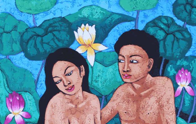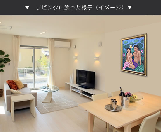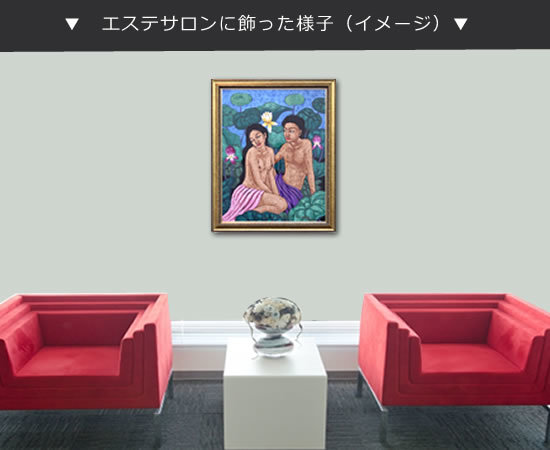 中サイズの絵画なので、家のリビングや玄関、エステサロンや美容院など様々な場面で飾っていただけます。蓮のグリーンを背景にリラックスした男女が会話を楽しむ絵画に癒されます。