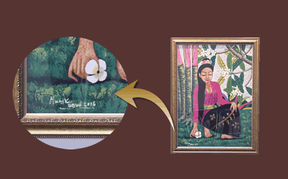当店のバリ絵画には画家の直筆サインと証明書が付いています。これは画家が作品を承認したという証拠です。世界で一つしかない絵画という証明になります。