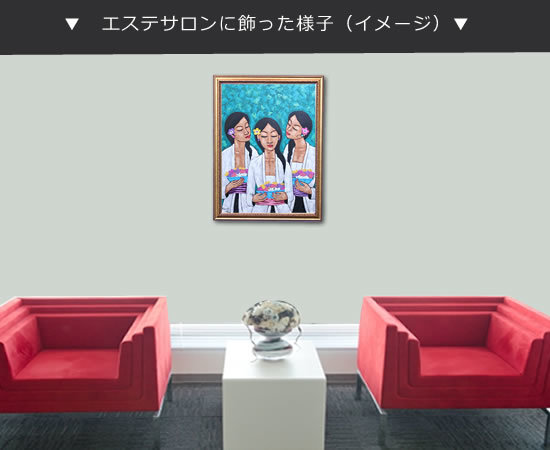 中サイズの絵画なので、家のリビングや玄関、エステサロンや美容院など様々な場面で飾っていただけます。神聖な場所に向かう穏やかな表情の女性に癒されます。