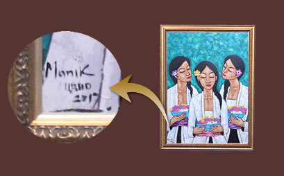 当店のバリ絵画には画家の直筆サインと証明書が付いています。これは画家が作品を承認したという証拠です。世界で一つしかない絵画という証明になります。