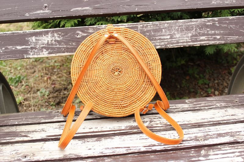 丸くて万華鏡のような編み方のアタバッグです。リュックなので動きやすく、肩紐には本皮を使用しており、おしゃれのアクセントになっています。当店のアタバッグはバリ島ウブド村の工房で一点一点丁寧に作られているので、末長くご使用いただけます。