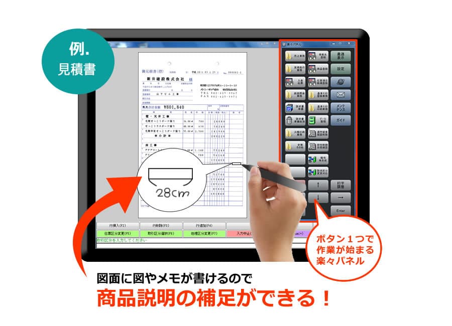 販売管理システムは、画面に表示されている伝票に図やメモを直接書くことが