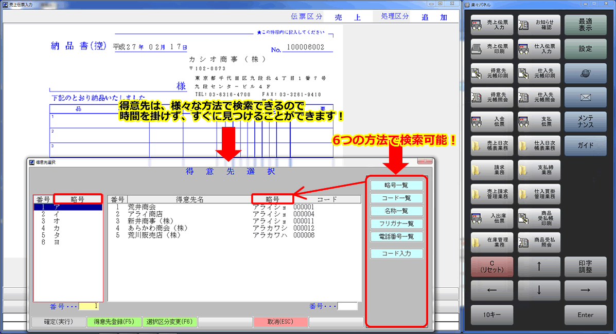 得意先の選択には、略号、コード一覧、会社名、フリガナ、電話番号、コード入力から、探しやすい方法を選び、すぐに呼び出したい得意先データが表示されるので、検索に時間を掛けることなく、スピーディーに伝票発行が開始出来ます。(下図を参照下さい)