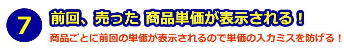 商品ごとに、前回の売上単価が表示されます。得意先ごとに、商品単価が異なる場合は、とても便利です。金額の入力ミス防止や、過去データを探す手間暇を省くことができ、伝票発行も効率良く進められます。(下図を参照下さい)