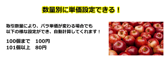 1.得意先毎にランク単価設定できます。都度計算する手間が省けるので、効率的に事務作業ができ、計算ミスも防げます!(下図を参照下さい)