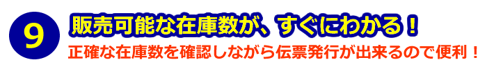納品書発行画面に、各商品ごとの販売可能数(在庫引当数)が自動表示されるので、在庫切れによる機会損失や、在庫待ちという状況を回避でき、お客様をお待たせせず、スムーズな取引を行えます。正確な販売可能数を表示できるので、計算ミスも防げます!(下図を参照下さい)