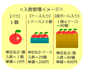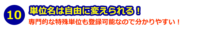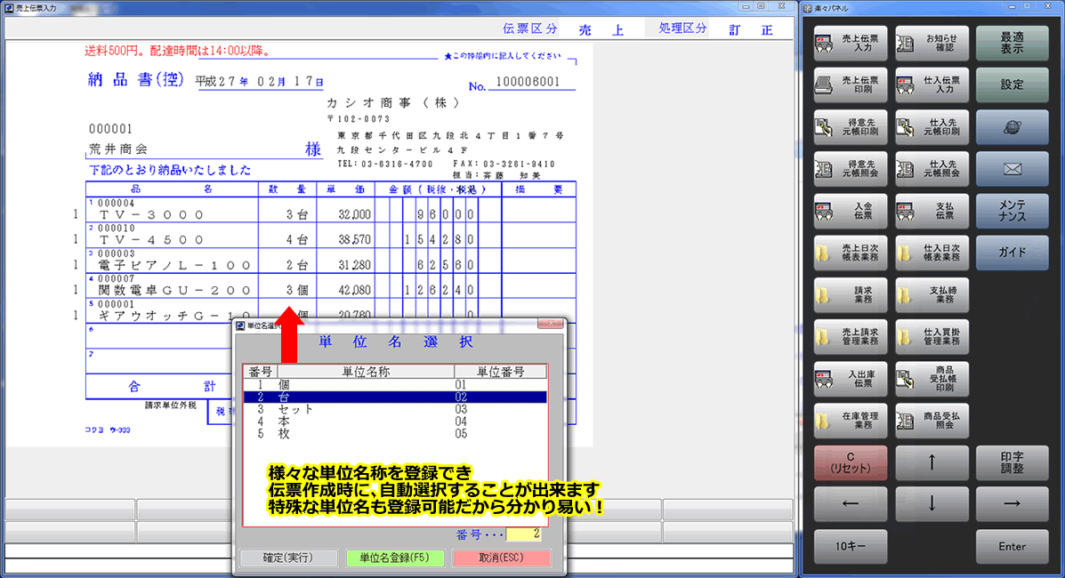 よくある単位名、個、台、セット、本、枚など以外にも、専門的な単位など様々な単位を登録することが出来ます。伝票発行時に自動選択できるので、得意先にも分かりやすい伝票を発行することが出来ます。(下図を参照下さい)