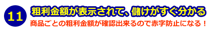 納品書(売上伝票)発行時に、各商品ごとの粗利額を伝票発行画面に表示することが出来ます。粗利額を確認しながら、納品書発行をすると、「この商品は、幾らの儲けなのか?」や、「この商品はマイナスだ!赤字になってしまう!」などの損失に気付くことが出来ます。(下図を参照下さい)