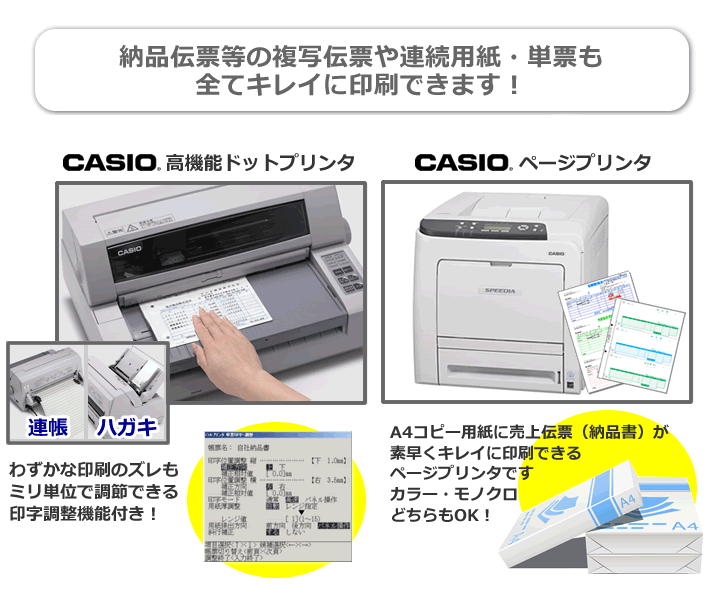 カシオ販売管理システムは、市販の複写伝票や、コピー用紙を利用した伝票、得意先指定伝票など、様々な伝票印刷をすることが可能です。上図の様な、カシオ高機能ドットプリンタやページプリンタで、キレイに印刷をすることができます。複写伝票は使わないというお客様には、今、会社でお使いの複合機(コピー機)で印刷することも可能です。お客様のニーズにあったプリンタで印刷を行うことが可能です。