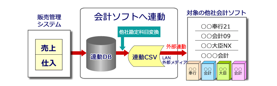 出力することができます。他社ソフトは外部連動のみで、連動情報の出力先として外部メディア以外に任意フォルダへの出力が可能です。データが繋がる事により、複数データをこの事務パソコンで管理出来るので、事務処理の効率がアップします!