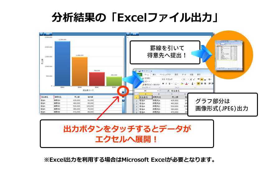 出力ボタンをタッチするだけで、蓄積されたデータを簡単にExcelファイルに出力できます!