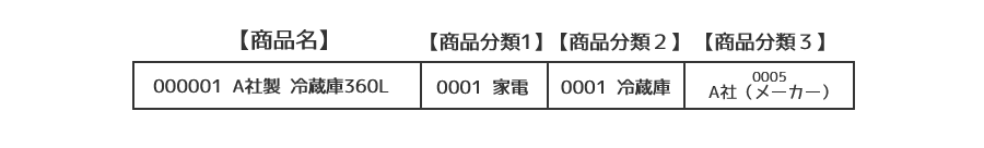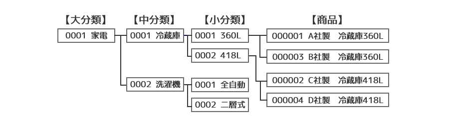 商品を大中小の3階層に分類できます。例えば、大分類で「家電」更に中分類で